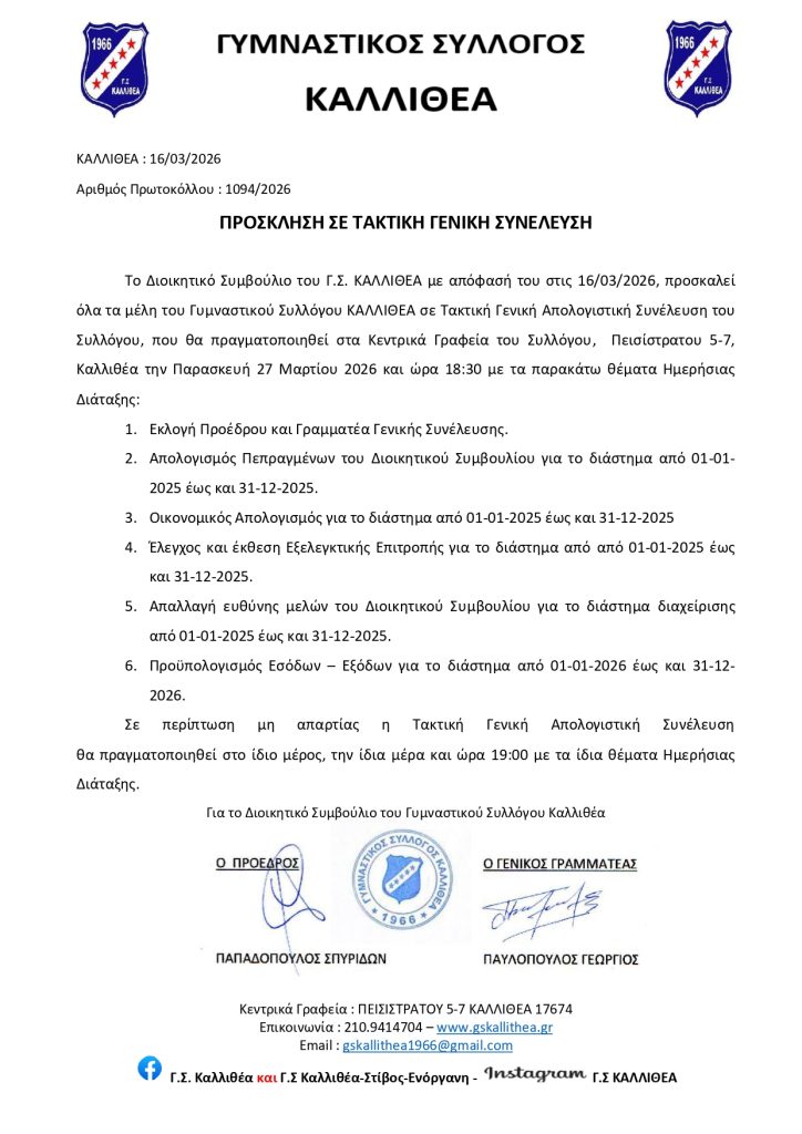 Δελτία Τύπου Νέα54321 0 (0 votes)The estimated reading time is less than a minute ΠΡΟΣΚΛΗΣΗ ΑΠΟΛΟΓΙΣΤΙΚΗ ΓΕΝΙΚΗ ΣΥΝΕΛΕΥΣΗ gs kallithea 17 Μαρτίου 2026 at 1:01 μμ1 View0